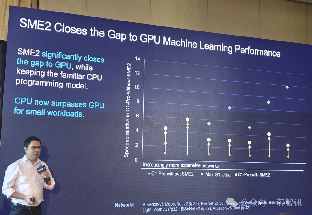 Arm表示,SME2 显著缩小了C1 CPU与GPU之间的AI性能差距,特别是在小型AI工作负载上,CPU 现已超越 GPU,并且保留了CPU的灵活性。