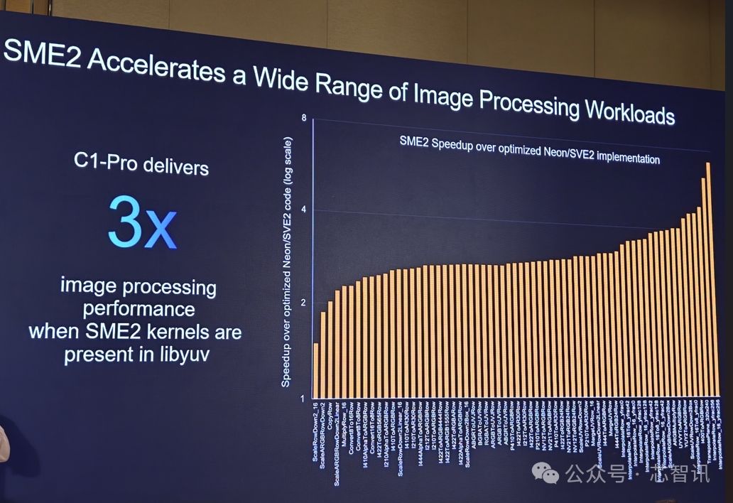 SME2 还可加速各种图像处理工作负载,比如在libyuv中,支持SME2的C1-Pro的图像处理表现提升到了原来的3倍。