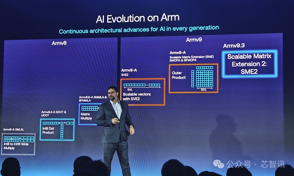 进入到 Armv9 架构,Arm在 CPU 上集成了用于加速和保护如大语言模型 (LLM) 等先进的生成式 AI 工作负载的特性。比如,Armv9-A 加入了可伸缩矢量扩展 2 (SVE2),用于数字信号处理器 (DSP)、媒体和通用矢量化;Armv9.2-A 则首次引入了可伸缩矩阵扩展 (SME)指令,可加速 AI 和 ML 工作负载,并为 Arm CPU 上运行的 AI 和 ML 应用提供更高的性能、能效和灵活性。