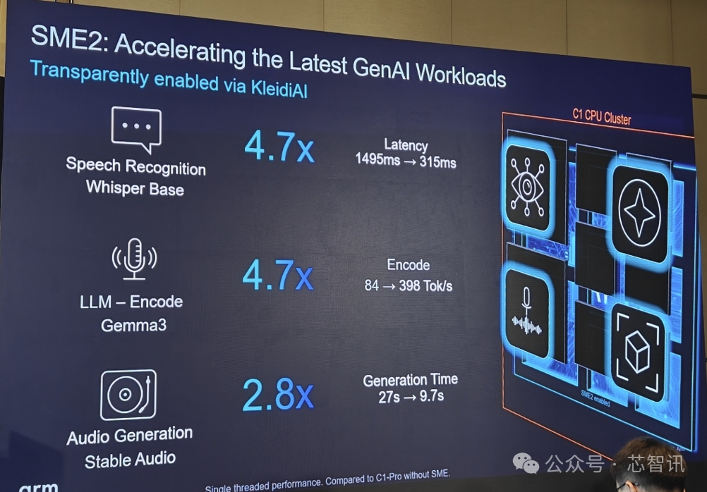 在 Whisper Base 上处理语音工作负载时,延迟降低 4.7 倍;在 Google Gemma 3 模型上进行聊天交互,AI 性能增长 4.7 倍;在 Stability AI Stable Audio 模型上生成音频,速度提升 2.8 倍。