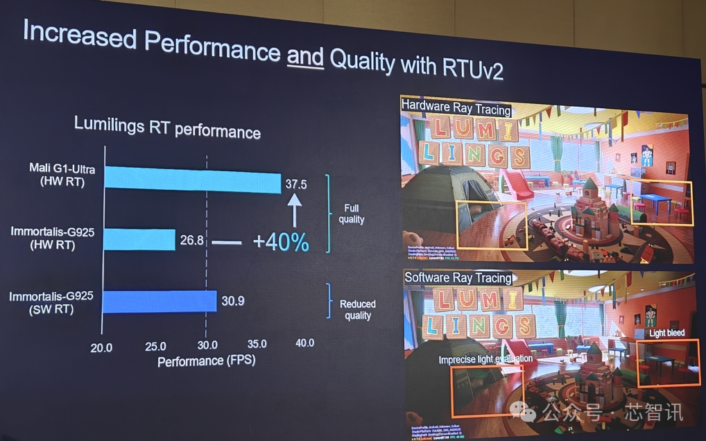全新的Mali G1-Ultra 则重新定义了移动 GPU 的性能,在光线追踪性能提升的同时,在架构效率和AI加速性能上也迎来了突破性进展,有望为新一代移动终端的游戏体验和AI应用带来更出色的体验。