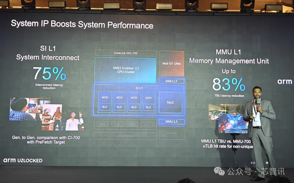 Lumex CSS平台要支持 AI 优先体验,自然不能只局限于CPU、GPU等计算 IP 和前面提到的多核调度的DSU IP的提升,还必须在整个互连和内存架构层面持续演进。所以,Arm为了Lumex CSS平台带来了全新的SI L1和MMU L1和NoC S3等系统IP,专为满足高要求 AI 和其他计算密集型工作负载的带宽与延迟需求而优化。