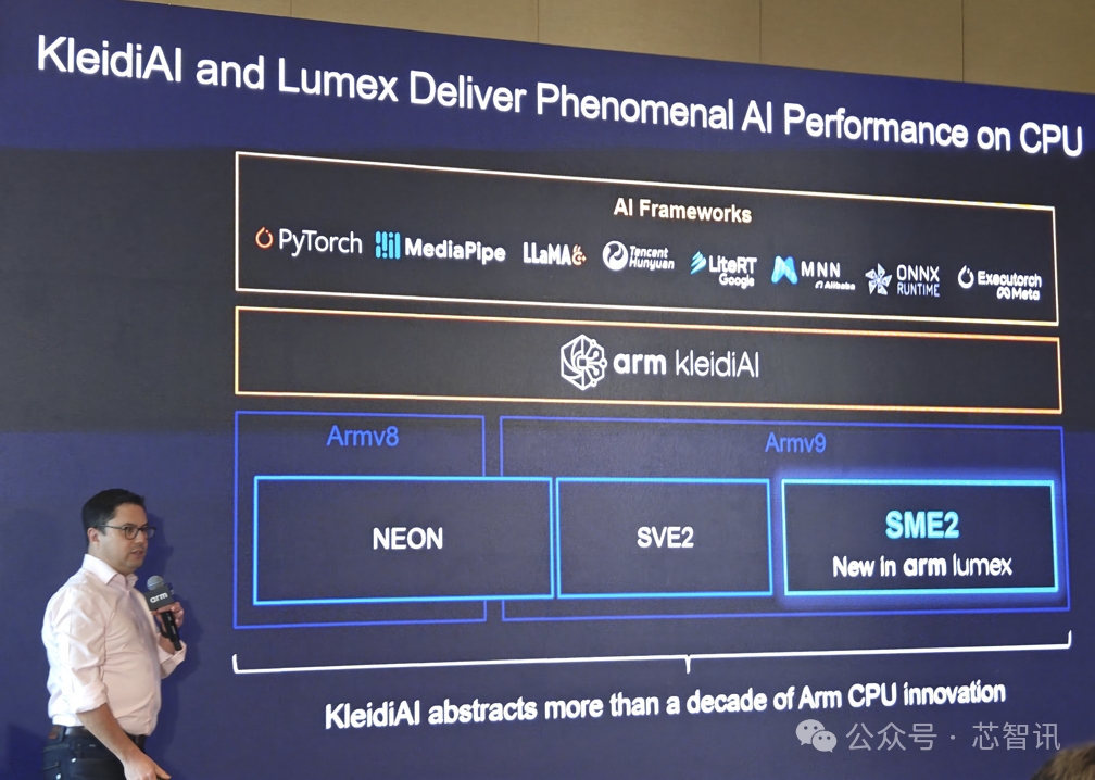 Arm KleidiAI 于 2024 年推出,旨在为Arm CPU 上运行的 AI 推理工作负载提供软件性能优化,开发者无需进行任何额外的工作,目前该软件库已应用于移动端、云和数据中心等关键领域,包括 KleidiAI 已被集成到 execuTorch、Llama.cpp、MediaPipe、PyTorch、LightRT等几乎所有主流AI框架的最新版本中,开发者只需开始构建应用程序,即可在基于 Arm 架构的平台上自动获取性能的显著提升。