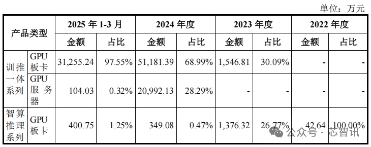 从沐曦股份公布的营收来源看,2023 年度、2024 年度和 2025 年 1-3 月,,沐曦股份的训推一体GPU板卡的销售额占比也是持续快速提高,各期占比分别为30.09%,68.99%和97.55%。这也进一步反应了沐曦股份的营收对于训推一体芯片曦云 C500系列的高度依赖。
