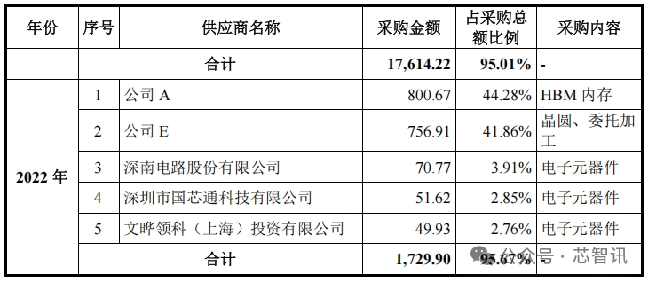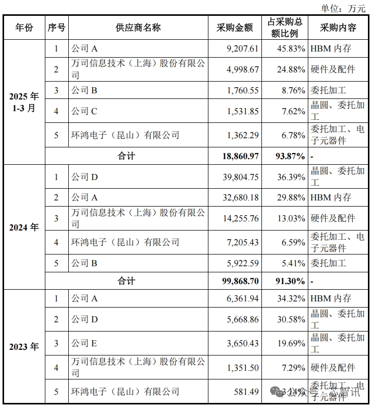 报告期各期,沐曦股份前五大供应商采购金额占当期采购总额的比例为 95.67%、95.01%、91.30%和 93.87%,前五大供应商采购占比相对稳定。其中,公司 D、公司 E、公司 C 为芯片供应商,公司向其采购晶圆及委托加工服务;公司 A 为HBM 内存等产品知名供应商,公司向其采购 HBM 内存,因此公司对上述供应商采购金额相对较高,不属于对单一供应商的依赖情况。报告期内,公司不存在对单一供应商采购比例超过 50%的情况。