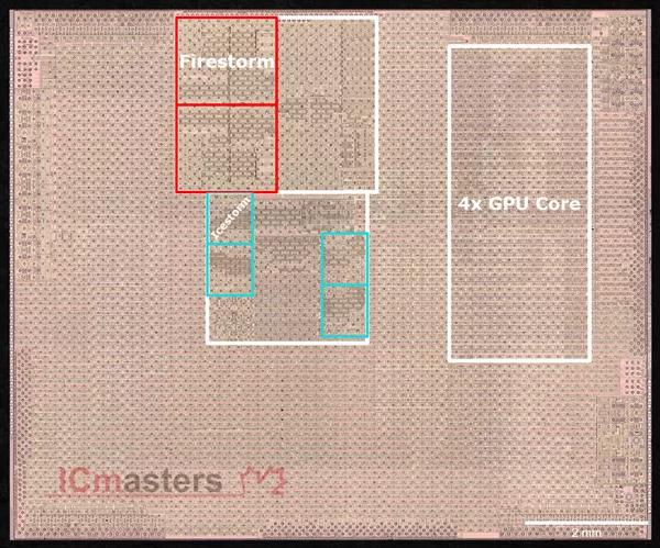 拆分来看,GPU核心占据11.65平方毫米,两个大核心的二级缓存用掉了9.1平方毫米的面积,四个小核心的二级缓存则只占6.44平方毫米。
