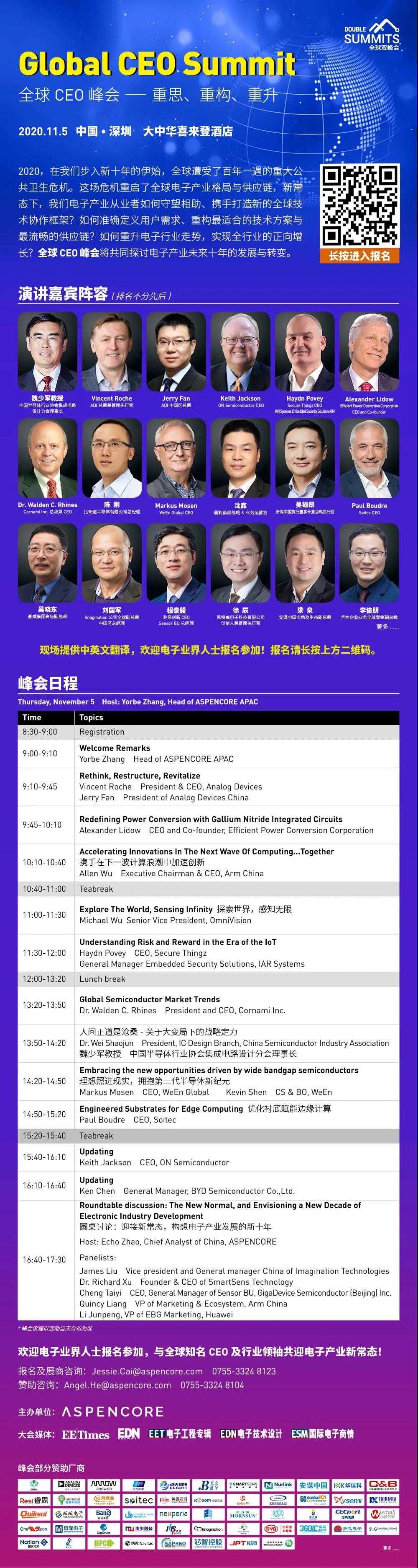 ASPENCORE 第三届全球双峰会依然选择在全球包容性最强的深圳举办,邀请全球电子行业话语性最强的领袖人物聚集一堂,与全行业与会嘉宾和观众分享碰撞最热门的技术话题,助力电子行业从业者把握市场未来。