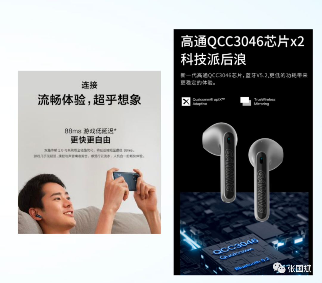 他举例说漫步者电竞耳机就是使用高通的qCC3046芯片,足以说明这一代的高通芯片的延时是可以满足手游竞技,电子游戏竞技,甚至吃鸡游戏的对音频和视频同步要求。