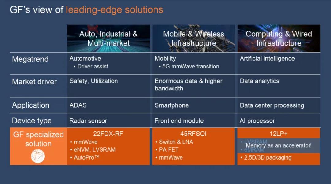 这些市场不过分追求高级工艺而是需要能优化功能的成熟平台。市场需要针对特定应用量身打造的其他类型的创新技术。格芯称它们是特定领域解决方案,而这正是格芯的专长所在。