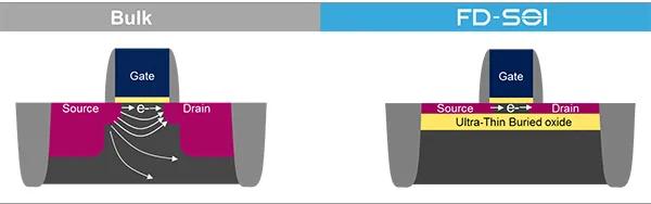 从结构上看, FD-SOI晶体管的静电特性优于传统体硅技术。埋氧层可以降低源极和漏极之间的寄生电容,还能有效地抑制电子从源极流向漏极,从而大幅降低导致性能下降的漏电流。