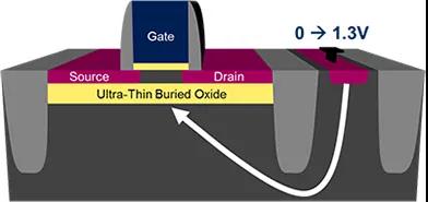 全耗尽型绝缘体上硅(FD-SOI)是一种平面工艺技术,它依赖于两项主要技术创新。首先,在衬底上面制作一个超薄的绝缘层,又称埋氧层。然后,用一个非常薄的硅膜制作晶体管沟道。因为沟道非常薄,无需对通道进行掺杂工序,耗尽层充满整个沟道区,即全耗尽型晶体管。这两项创新技术合称“超薄体硅与埋氧层全耗尽型绝缘体上硅”,简称UTBB-FD-SOI。