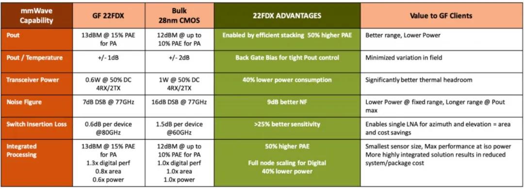 下图显示,与标准28nm体硅CMOS技术相比,格芯的22FDX平台为汽车雷达系统制造商提供了显著优势。