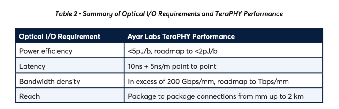 在硅光模块中,光子链路连接到同一封装中的高性能IC,同时借助外部激光器提供光源。该封装通过光纤连接到另一个采用光子链路的模块,从而形成封装到封装高速互连,同时大幅降低功耗。下图是采用电信号进行数据传输时的功耗测算。