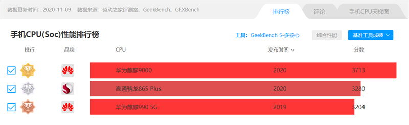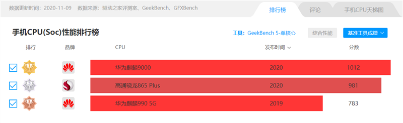 这是麒麟9000与骁龙865+以及麒麟990 5G SoC对比
