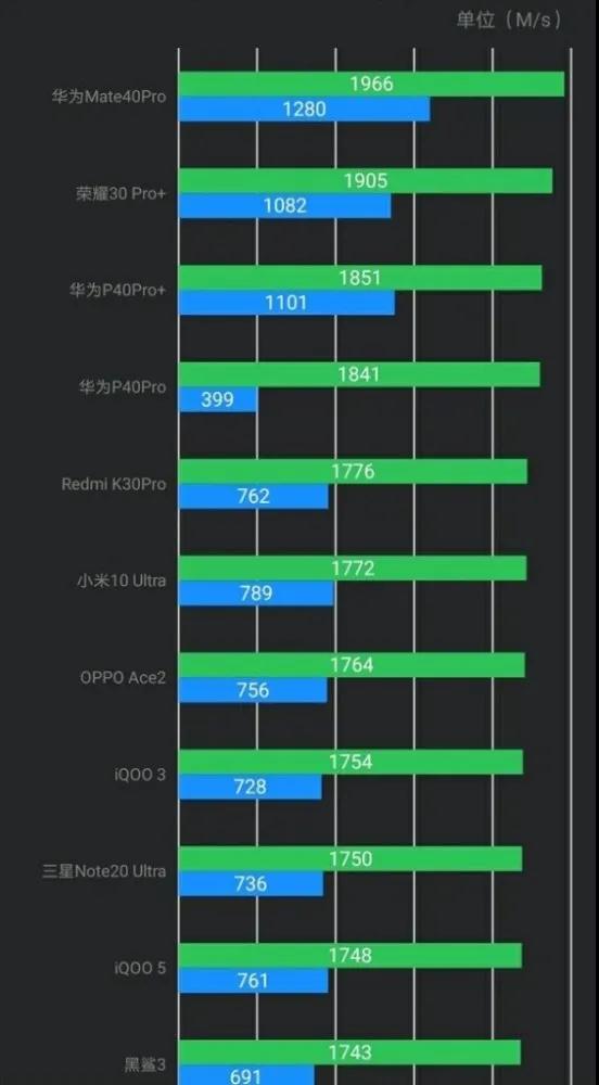 根据网友对于华为Mate40 Pro闪存性能的实际测试显示,华为Mate40 Pro的持续读取、写入速度分别达到了1966MB/s、1280MB/s,远高于其他旗舰手机。作为对比,搭载骁龙865+的三星Note20 Ultra读写速度分别为1750MB/s、736MB/s,搭载骁龙865、采用UFS3.1闪存的小米10至尊版的读写速度分别为1772MB/s、789MB/s。