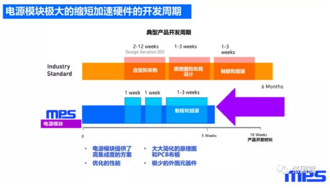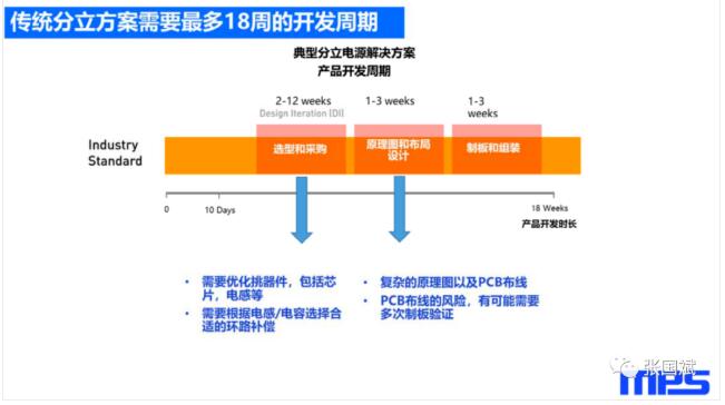 而电源产品在这个加速卡研发过程中实际上是占有时间较多,对于传统的分立电源解决方案,要从选型和采购开始,就需要挑选各种器件,包括芯片,包括产品的驱动芯片还有功率管,还需要需要根据不同的电感/电容选择合适的环路补偿,这非常耗时。而且原理图和布局设计也是比较复杂,同时由于有比较复杂的PCB源布线和原理图,那么就会有可能出现风险,出现多次制板的验证。