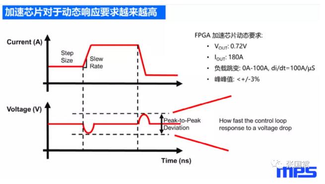 这是一个典型的加速芯片对于输入电流和输入电压的要求和波形。典型的输入电压是0.72V,它需要的满载电流是180A。为了满足这个应用环境当中对于资源的调用,就要求负载跳变需要 0A-100A, 这是一个很大的动态,这里说的0-100A是步长;同时呢,它的di/dt(上升沿)也是一个非常快的速率,因为这个速率取决于逻辑单元调用(打开)的速率,假如说它从时间点1到时 间点2,迅速从这个资源要增加逻辑门资源的调用,那么它的Slew Rate就非常得快,所以就造成了FPGA这种内核供电对大动态的要求。在这种大动态电流要求的背景下,输出电压还要不能出现太大的波动,典型的峰峰值应该要求的是<+/-3%。