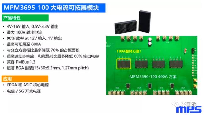 “我们电源模块的解决方案呢,极大地缩短了这种加速硬件的开发周期。大家可以看到,我们可以在1周内把选型、采购还有原理图设计在2周内全部都完成,然后去制板和组装。这个是由于我们的电源模块做了高程度的集成和优化,那么客户上板以后就不需要再做额外的优化采购的动作,也大大地简化了它的原理图和PCB布线。所以说可以把开发周期极大地缩短。”他指出。“这对于加速厂商来讲,是非常重要的去应对新的加速应用的环境。” MPS针对加速卡推出的大电流电源模块 基于这样的趋势,MPS推出了瞄准加速卡应用的电源模块,以MPM3695-100 大电流可拓展模块为例,它的主要特点是 支持4V-16V 输入; 0.5V-3.3V 输出,它可以支持最大 100A 的输出电流。该解决方案非常紧凑。把功率管控制IC,以及一些被动元件电感电阻全都集成在15x30mmBGA封装中,外围器件很少。