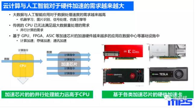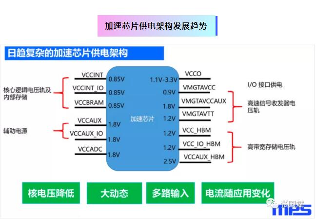 “过去几年,大数据与人工智能产业高速发展,激发了一大批基于大数据与人工智能的应用,如机器学习、图片识别、信号处理,仿真引擎等等。这些应用的出现,对数据中心以及云计算相关的基础架构提出了更高的要求,因为这些新的应用会提出超级大的数据量需求。”5月14日,在MPS新品发布会上,MPS大电流模块产品经理杨恒指出,“传统的基于 CPU 的软件的处理和加速,已经无法满足新型基于人工智能和大数据的应用,所以出现了很多基于GPU、FPGA,ASIC 等这种加速芯片的加速硬件。加速芯片可以提供不少于20倍的加速能力,现在越来越多的数据中心会应用基于加速芯片的硬件加速卡,这些加速卡基本上分为三类:计算加速;存储加速;通讯加速。基本上在数据处理的整个环节都有加速的应用。各大加速芯片制造商也推出了各种基于他们自家芯片的硬件加速卡。如赛灵思就推出了ALVEO系列,应用于数据中心的各个领域,他们还会推出应用在不同领域的加速卡如通信类、金融类等等。随着加速卡的越来越广泛应用,也给电源设计方案提出了更多的挑战!”