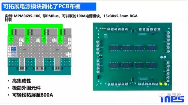 “从PCB布板的角度来讲,可以看到左边是MPM3695-100它的典型的Layout,它是采用BGA封装的,我们的输入的BGA焊球和输出的BGA焊球位置都是经过优化的,信号线位置都放在旁边,所以说对客户的Layout是非常友好的。它可以非常简单地扩展到800A的解决方案,右边这个图展示的就是一个800A解决方案的Demo板,上面用了是8颗MPM3695-100的模块。”他进一步解释说。