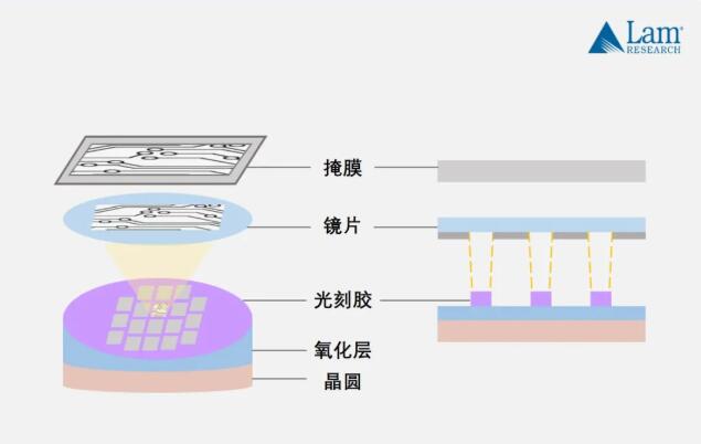在晶圆上覆盖光刻胶薄膜后,就可以通过控制光线照射来完成电路印刷,这个过程被称为“曝光”。我们可以通过曝光设备来选择性地通过光线,当光线穿过包含电路图案的掩膜时,就能将电路印制到下方涂有光刻胶薄膜的晶圆上。