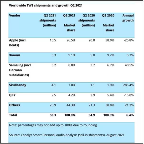 (快科技)调研机构Canalys发布的最新报告指出,2021年第二季度真无线耳机总出货量5830万只,较去年同期增长6.4%,但是比较意外的是苹果AirPods系列无线耳机的销量暴跌了25%。