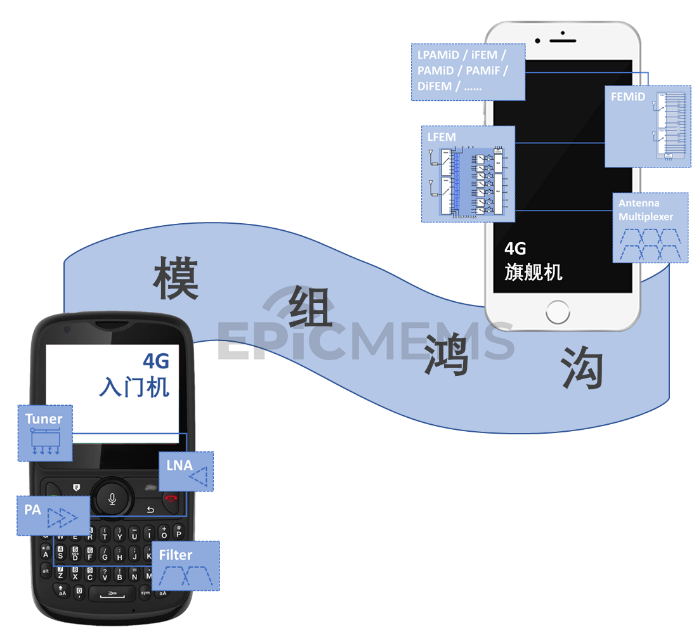 射频模组芯片,不是一个新生的产品系列。事实上,射频模组芯片的使用几乎与LTE商业化同时发生。过去10年内,各种复杂的射频模组已经普遍应用在了各品牌的旗舰手机中;与此同时,在大量的入门级手机上,分立器件的方案也完全能够满足各方面的要求。因此在过去10年就出现了泾渭分明的两个市场:旗舰机型用模组方案;入门机型用分立方案。模组方案要求“高集成度和高性能”,因而价格也很高;而分立方案要求“中低集成度和中等性能”,售价相对而言就低不少。两种方案之间存在巨大的技术和市场差异,我们可以把这个称作4G时代的“模组鸿沟”。