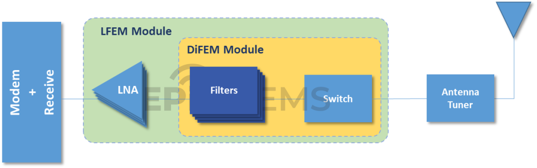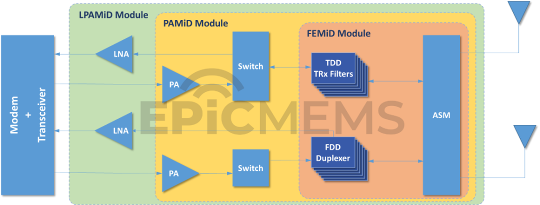 射频前端模组是将射频开关、低噪声放大器、滤波器、双工器、功率放大器等两种或者两种以上的分立器件集成为一个模组,从而提高集成度和性能,并使体积小型化。根据集成方式的不同,主集天线射频链路可分为:FEMiD(集成射频开关、滤波器和双工器)、PAMiD(集成多模式多频带PA和FEMiD)、LPAMiD(LNA、集成多模式多频带PA和FEMiD)等;分集天线射频链路可分为:DiFEM(集成射频开关和滤波器)、LFEM(集成射频开关、低噪声放大器和滤波器)等。