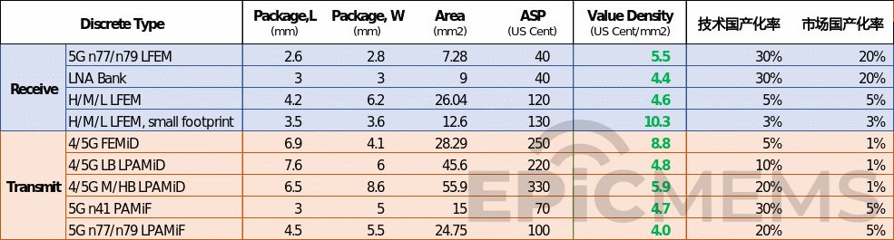 接收5:接收芯片的最高复杂度,就是H/M/L的LFEM。这类产品以非常小的尺寸,实现了10~15路频段的滤波(SAW Filter)、通路切换(RF-Switch)以及信号增强(LNA),具有超高的Value Density值(10左右),在5G项目上能帮助客户极大地压缩Rx部分占用的PCB面积,把宝贵的面积用在发射/天线等部分,提升整体性能。这类产品需要的综合技能最高,也基本必须要用WLP形式的先进封装方式才能满足尺寸、可靠度、良率的要求。