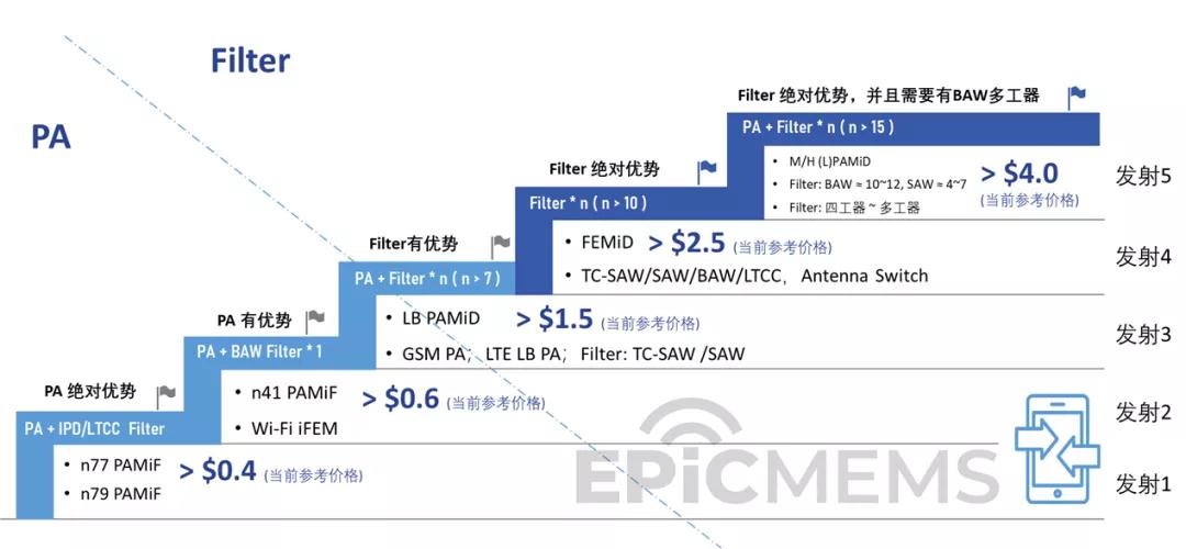 发射2:PA与BAW(或高性能SAW)的集成,典型产品是n41的PAMiF或者Wi-Fi的iFEM类产品,频段在2.4GHz附近。这类产品的频段属于常见频段,PA部分的技术规格有一定挑战但并不高。由于工作在了2.4GHz附近,频段非常拥挤,典型的产品内需要集成高性能的BAW滤波器来实现共存。这类产品由于滤波器的功能并不复杂,PA仍有技术控制力;但在成本方面,滤波器可能超过了PA。综合来讲,这类产品属于有挑战但不复杂的产品,PA有一定的控制力。