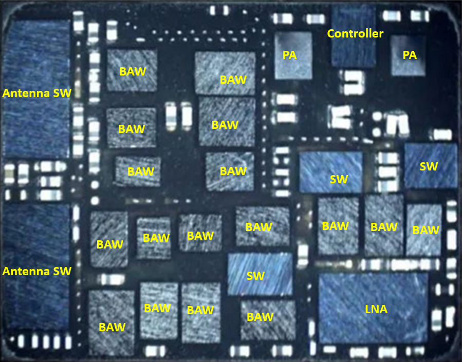 这类高端产品的市场,目前主要由美商Broadcom、Qorvo、RF360等厂商占据。下图是Qorvo公司在其官方公众号上提供的芯片开盖分析。可以看到,该类产品包含10颗以上的BAW,2~3颗的GaAs HBT,以及3~5颗SOI和1颗CMOS控制器,具有射频产品最高的技术复杂度。该类产品通常需要集成四工器或者五/六工器这类超高VD值的器件。