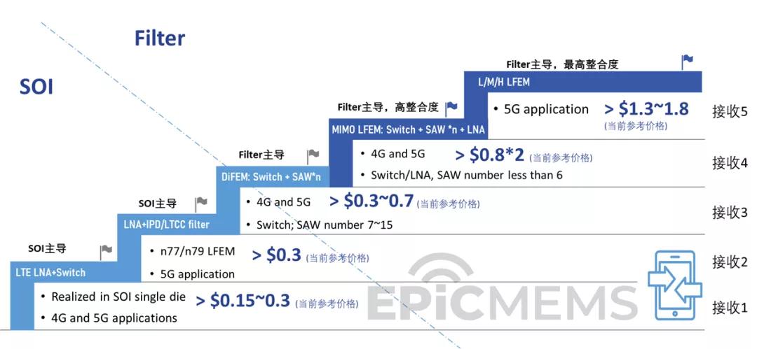 接收4:这类产品叫做MIMO M/H LFEM。主要是针对M/H Band的频段(例如B1/3/39/40/41/7)应用了MIMO技术,增加通信速率,在一些中高端手机是属于入网强制要求。看起来通信业对M/H这个黄金频段果然是真爱啊。技术角度出发,这类产品以RF-SOI技术实现的LNA加Switch为基础,再集成4~6个通路的M/H高性能SAW滤波器。国际厂商在这些频段已经开始普遍使用TC-SAW的技术,以达到最好的整体性能。