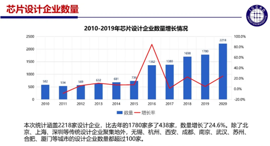 在山城重庆举办的2020年ICCAD上,中国半导体行业协会IC设计分会理事长魏少军教授的重量级报告呈现出了在新常态下中国IC设计业的现状:2020年中国本土IC设计公司达到了2218家,较2019年增加了438家,销售额增长23.9%,较2019年提升4.1%;布局也在发生变化,除北京、上海、深圳等传统集成电路设计企业聚集地外,无锡、杭州、西安、成都、南京、武汉、苏州、合肥、厦门等城市的设计类企业数量都超过了100家。同时,中国开始进入以CPU为代表的高端芯片领域。尽管差距仍在,但国产CPU由专用领域转向公开市场领域,是具里程碑意义的重要一步。