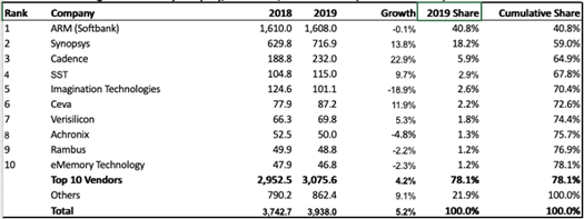根据市场分析公司IPnest发布的2019年全球半导体IP厂商的营收排名,目前全球主要IP 供应商包括Arm、Synopsys、Cadence、SST、Imagination Technologies、CEVA、VeriSilicon、Achronix、Rambus和eMemory。
