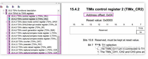 偏移地址就是在基地址基础上偏移(一般是以4字节增加),比如TIM定时器的偏移地址: