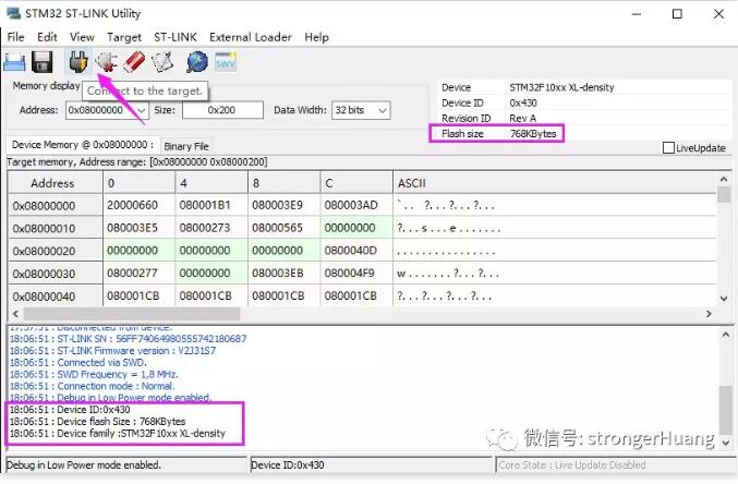 通过ST-Link连接芯片,直接读取,可以看到容量信息: