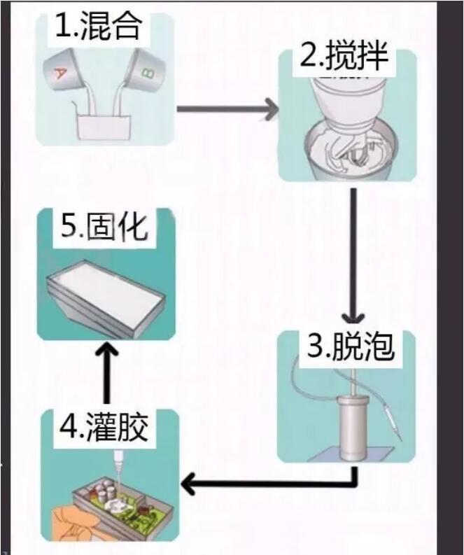 五、灌封工艺 灌封产品的质量,主要与产品设计、元件选择、组装及所用灌封材料密切相关,灌封工艺也是不容忽视的因素。环氧灌封有常态和真空两种灌封工艺。 环氧树脂.胺类常温固化灌封料,一般用于低压电器,多采用常态灌封。 环氧树脂.酸酐加热固化灌封料,一般用于高压电子器件灌封,多采用真空灌封工艺。 目前常见的有手工真空灌封和机械真空灌封两种方式,而机械真空灌封又可分为A、B组分先混合脱泡后灌封和先分别脱泡后混合灌封两种情况。其操作方法有三种: 第一种:单组份电子灌封胶,直接使用,可以用抢打也可以直接灌注; 第二种:双组份缩合型电子灌封胶,固化剂2%-3%或其他比例,搅拌-抽真空脱泡-灌注; 第三种:加成型电子灌封胶,固化剂1:1、10:1; 工艺流程如下: (1)手工真空灌封工艺 (2)机械真空灌封工艺 1)计量:准确称量A组分和B组分(固化剂)。 2)混合:混合各组份; 3)脱泡:自然脱泡和真空脱泡; 4) 灌 注:应在操作时间内将胶料灌注完毕否则影响流平; 5)固化:加温或室温固化,灌封好的产品置于室温下固化,初固后可进入下道工序, 完全固化需8~24小时。夏季温度高,固化会快一些;冬季温度低,固化会慢一些。