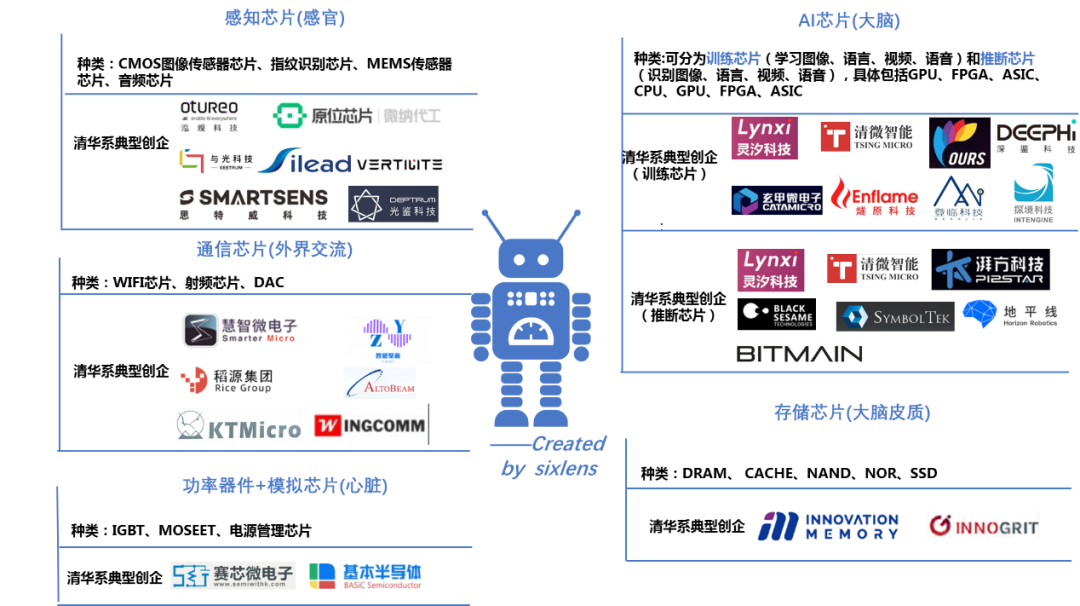 按照功能对芯片进行分类,芯片可分为AI芯片、存储芯片、感知芯片、通信芯片以及功率器件等。类比到人类的器官功能,AI芯片可类比为大脑,存储芯片可类比为大脑皮质,感知芯片可类别为感官等。Sixlens数据显示,清华系创企分布在芯片的各个领域,现分领域选取典型创企对其技术布局、投融资等情况进行详细说明,并洞察其所在行业概况。