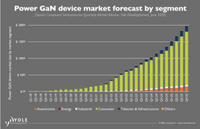 根据Yole的预测,GaN将主要应用在消费电子、汽车电子、电信技术设施等。在氮化镓领域,GaN器件集成的主要趋势是系统级封装或片上系统解决方案。 其实,GaN功率器件主要销售给电子市场,对于消费市场来说,这是一个明显的技术趋势。比较典型的就是快充,快充头产品中主要包括两块核心部件,一是电源管理IC芯片,另一块是功率分立器件。快充的要求是功率密度和效率。所以企业就必须以这种外形尺寸真正压缩系统并降低每功率价格。