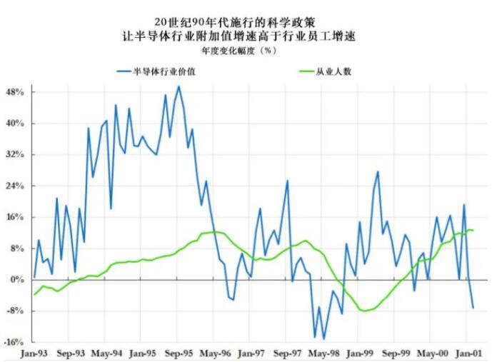 在20世纪90年代施行的科学政策下,半导体行业附加值的增速比员工增长更快 在半导体行业诞生的早期,相对对价格不敏感的政府合同占总销售额的很大一部分,这种低效被视为创新的成本。但随着外国竞争对手出现,注重成本的商业市场成为半导体的主要买家,这种能力复制似乎纯粹以成本为中心,对许多公司来说几乎没有了吸引力。对盈利能力的担忧意味着,为了在对价格高度敏感的竞争环境中保持对成本的控制,应确保尽可能少的重复工作。这引发了美国半导体行业的集体行动问题,削减开支似乎符合每家公司的利益,但这样做进一步恶化了美国公司的创新能力。