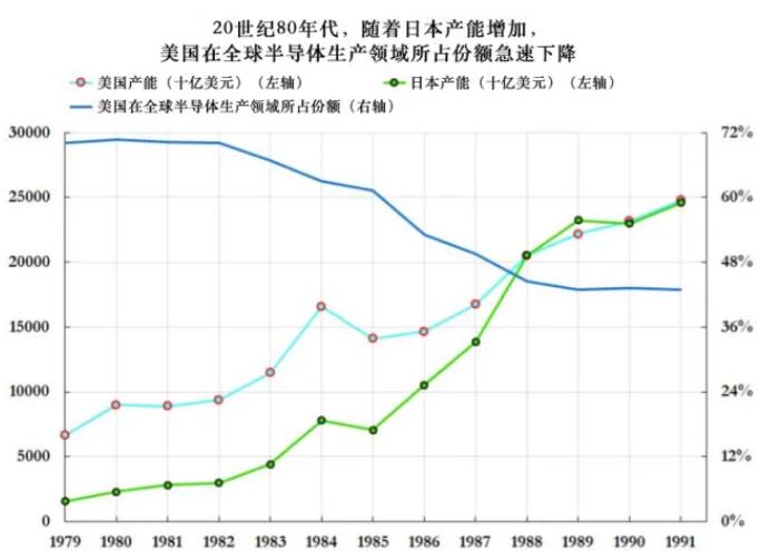 日本使用了与美国半导体行业诞生之初相同的产业政策,包括集中化指导、签署采购协议、鼓励融资等,以迅速扩大产能并主导全球市场。然而,日本采取了略有不同的战略,即专注于为迎合出口市场研究更容易理解的技术,而不仅仅是聚焦国防领域的需求。当DRAM成为标准,并成为半导体行业中最大的单一市场后,日本很快就占据了主导地位。