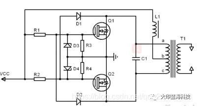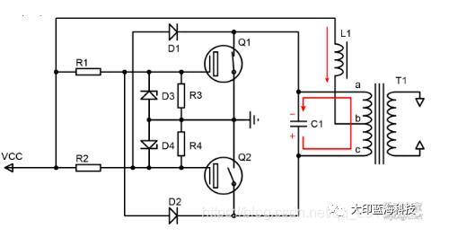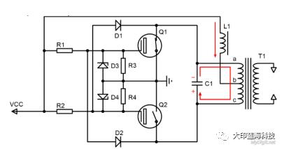 1.上电时L1通入的电流为零,电源通过R1、R2是Q1、Q2导通,L1电流逐渐增加,由于两个开关管特性差异,将导致流入两个开关管的电流不同,假设Q1电流大于Q2电流,所以Q1栅极电压高于Q2栅极电压,通过两个二极管D1、D2,使得a点电压低于c点电压,故T1将产生b为正,a为负的感应电压,于是通过T1形成正反馈,使Q1导通,Q2截止。完成启动过程。