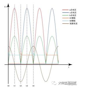 4.(t1~t2时间)C1开始通过T1由c到a放电,C1电压即c点电压正弦变小,T1电流由c到a正弦变大。