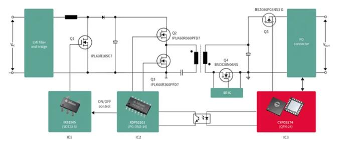 完整的解决方案如图3所示。PFC级采用临界导通模式IRS2505和ThinPAK封装IPL60R185C7 CoolMOS?,而DC-DC级则采用数字PWM控制器XDPS2201和IPLK60R360PFD7。同时,BSC028N06NS用作同步整流开关(将来可以换成专门针对充电器同步整流用的低压ISZ0702NLS以进一步提升性价比),协议控制器为CYPD3174,而p-channel MOS BSZ086N03NS3用作输出安全开关。