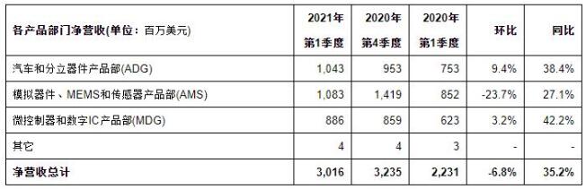 除射频通信(以前的“数字”)子业务部外,意法半导体所有产品部门都实现净销售收入同比增长。其中,汽车和分立器件部营收为10.43亿美元(约67亿人民币),同比增长38.4%。模拟器件、MEMS和传感器产品部营收为10.83亿美元(约69.64亿人民币),同比增长27.1%。微控制器和数字IC产品部营收为8.86亿美元(约56.97亿人民币),同比增长42.2%。此外,OEM和代理渠道的净销售收入分别同比增长21.4%和76.2%。