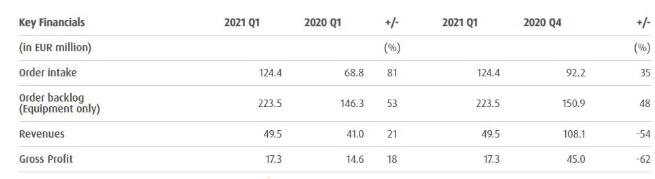 爱思强2021年前三个月的订单接收量同比增长81%,达到1.244亿欧元(约9.73亿人民币),而去年同期为6880万欧元(约5.38亿人民币),也超过了去年第四季度的最高订单量(9220万欧元,约7.2亿人民币)。毛利润为1730万欧元(约1.35亿人民币),比上年同期增长18%,毛利率为35%。