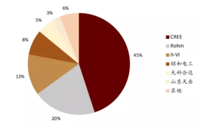 回顾碳化硅产业发展史,曾经的美国CREE公司仿佛一座不可逾越的大山,长时间垄断了全球80%以上的碳化硅材料的市场份额。然而,近年来美国II-VI、美国GT advanced、德国Sicrystal、日本昭和电工以及一些来自中国的后期之秀(主要包括中电科半导体材料公司、天科合达、山东天岳等等)纷纷向CREE公司发起了挑战。2018年底,CREE公司的市场占有率虽然有所下降,但是依然高达62%。2020年,CREE公司的市场占有率再次大幅度下降17%,跌至45%。