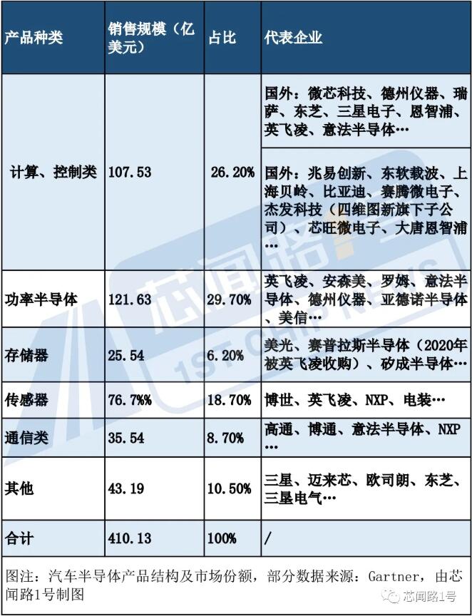 在一辆汽车所装备的所有半导体器件中,MCU大概占三成,平均下来每辆车要用到70颗以上的MCU芯片。再加上汽车从“功能机”进化为“智能机”,从“汽车电子”到“无人驾驶”,也进一步提升了车用MCU的市场规模。据市场研究机构Gartner的数据了解,在汽车电子芯片需求中,计算、控制类芯片和功率半导体芯片是目前市场需求规模最大的两类,各占汽车芯片总体需求的26.2%和是29.7%,二者合计规模达到229亿美元,占到了全部汽车半导体市场的55%以上。