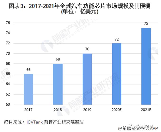 据ICVTanK的数据资料了解到,全球汽车功能芯片预计市场规模有望从2019年70亿美元稳步提升至2021年75亿美元。