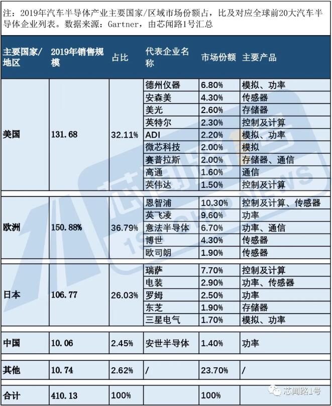 据市场研究机构Gartner的数据显示,欧洲汽车半导体2019年产值以150.88亿美元占全球汽车半导体总产值的36.79%,市场份额全球第一;美国以全球市占率32.64%位居第二;其次日本占全球26.03%的市场份额。中国大陆2019年汽车半导体实现销售收入仅为10亿美元左右,占比不到3%,和欧美日相比,差距很大。